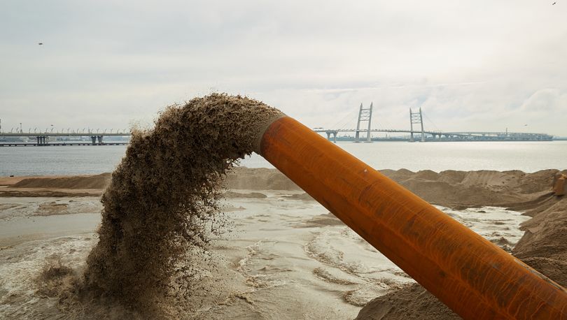 В 130 км от городской береговой линии находится подводное месторождение, откуда с помощью плавучего землесоса «Ленинградский-1» гидромеханизированным способом добывается больше 2 тыс. куб. м песка в час. «Чтобы добыть морской песок, надо разрыхлить его на дне залива с помощью специальных гидромониторов до образования пульпы – смеси воды, песка и примесей. Далее грунтовый насос, как домашний пылесос, перекачивает эту смесь в баржу», – объясняют специалисты «Группы ЛСР».