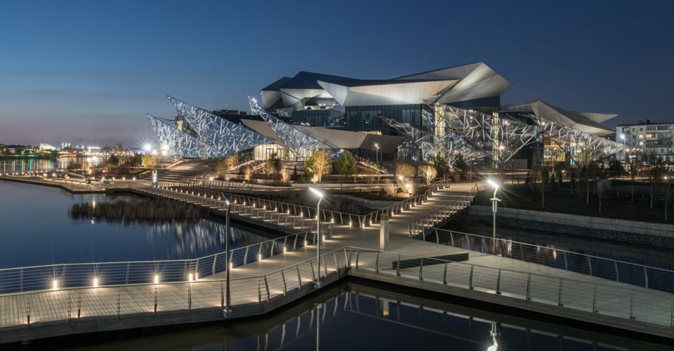 «Мы выиграли этот конкурс. Я был очень счастлив, потому что озеро прекрасно! — рассказывает архитектор Кенго Кума. — Наш конечный дизайн — как лед, который озеро иногда создает. Используя стекло и стальные структуры, мы попытались воплотить это природное явление. Здание является символом и обладает огромным потенциалом».