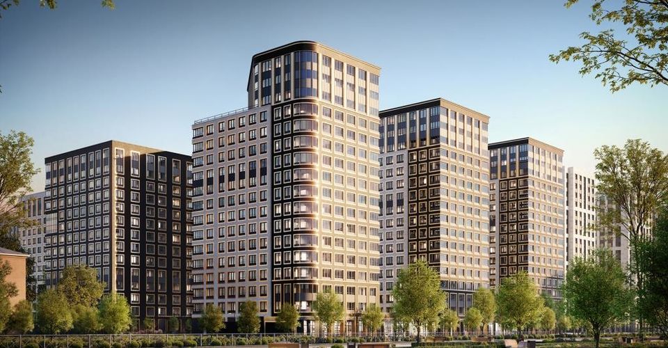 Фасады, облицованные керамогранитом светлых и темных оттенков, создают выразительный образ. Этот контраст подчеркивает объемы зданий переменной этажности (от 14 до 17 этажей в первой очереди), делая архитектурный ансамбль динамичным и современным.