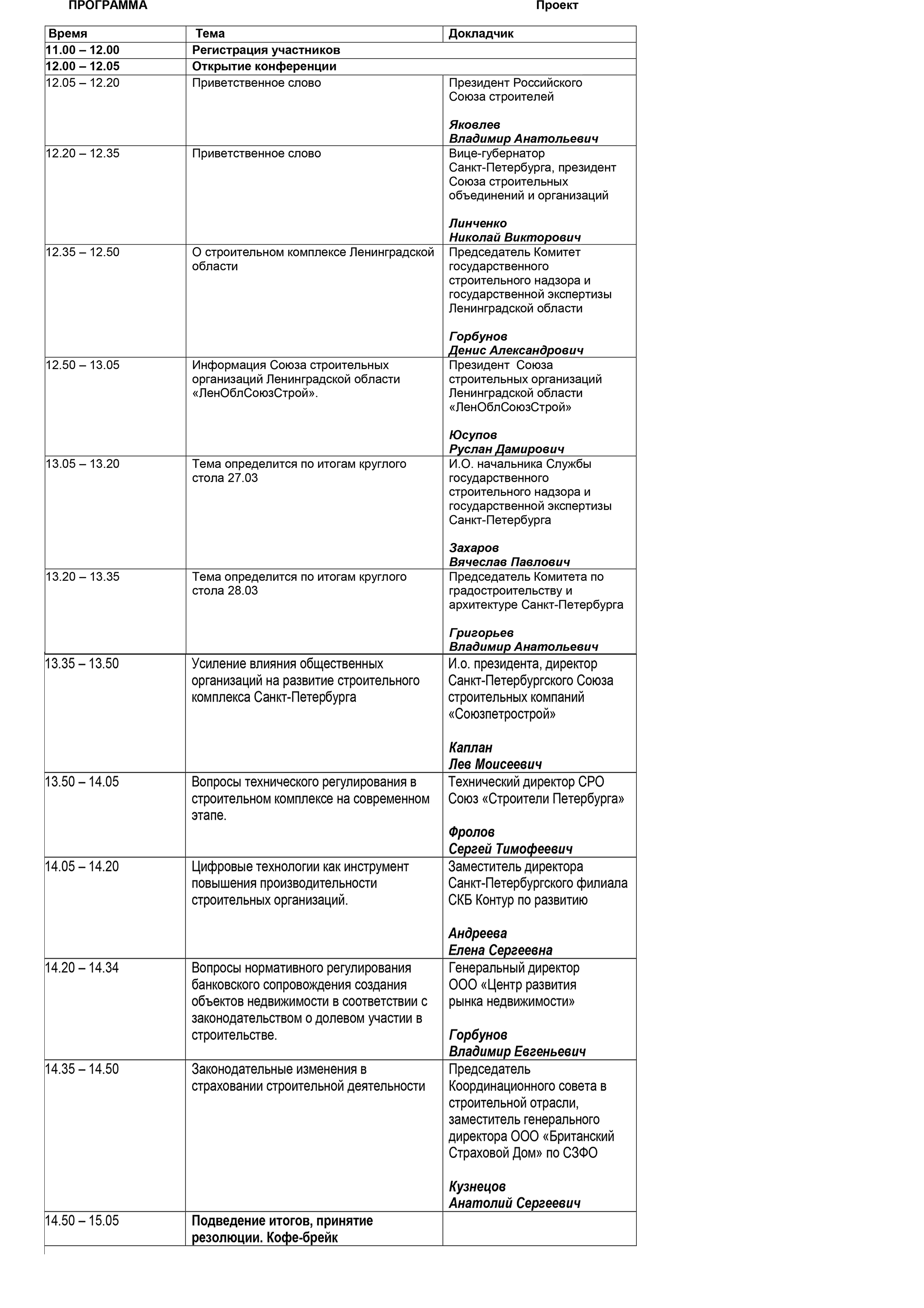 С докладами в рамках конференции выступят президент Российского Союза строителей В.А. Яковлев, вице-губернатор Санкт-Петербурга Н.В. Линченко, председатель Комитета государственного строительного надзора и государственной экспертизы Ленинградской области Д.А Горбунов, президент Союза строительных организаций Ленинградской области «ЛенОблСоюзСтрой» Р.Д.Юсупов, и.о. начальника Службы государственного строительного надзора и государственной экспертизы Санкт-Петербурга В.П. Захаров, председатель Комитета по градостроительству и архитектуре Санкт-Петербурга В.А. Григорьев.