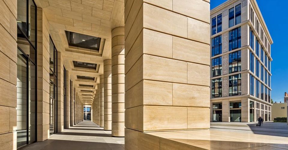 Фасады зданий выдержаны в стиле современной классики и построены на сочетании стекла и натурального камня Доломит Геналдон российского месторождения. Корпус 8 высотой в одиннадцать этажей выделяется своей эллиптической формой. Особенностью корпуса 9 высотой в девять этажей является атриум со стеклянной крышей и восемью панорамными лифтами.