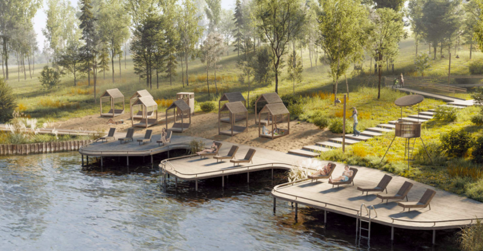 Территория проектирования берет свое начало у пешеходного моста и проходит по берегу вдоль существующего лесного массива до пожарной станции. В рамках первого этапа благоустройство коснется центральной части территории. Здесь предусматривается обустройство спуска к озеру Сенеж, а также пандуса из металлического настила на свайном основании. В конце спуска будет организована зона с шезлонгами и двумя спусками в воду на деревянном свайном покрытии, рядом – смотровая площадка и спуск для лодок. Справа от деревянного настила с шезлонгами оборудуют пляжную зону, с теневыми навесами, кабинкой для переодевания, а также спасательной вышкой.