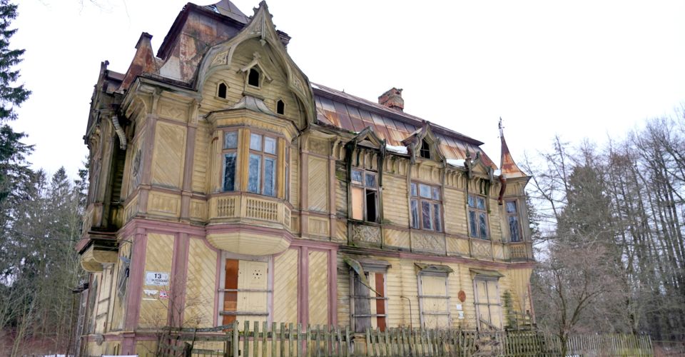 Одно-двухэтажный бревенчатый дом, с высокой шатровой кровлей центрального двухэтажного объема, является примером загородной постройки, в оформлении которой использованы мотивы готики.