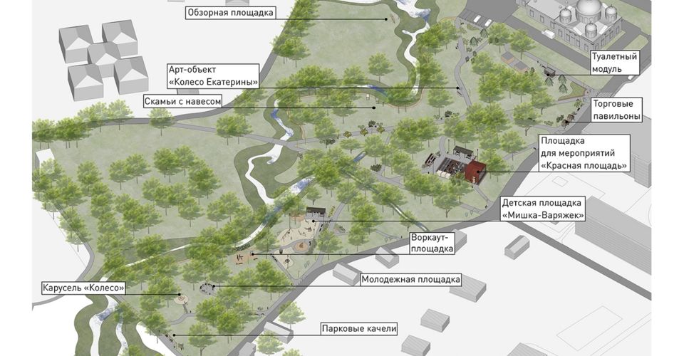 Концепция предусматривает бережное отношение к существующему озеленению, сохранение ценности парка как природного места отдыха для горожан и создание условий для круглогодичного функционирования этого общественного пространства.