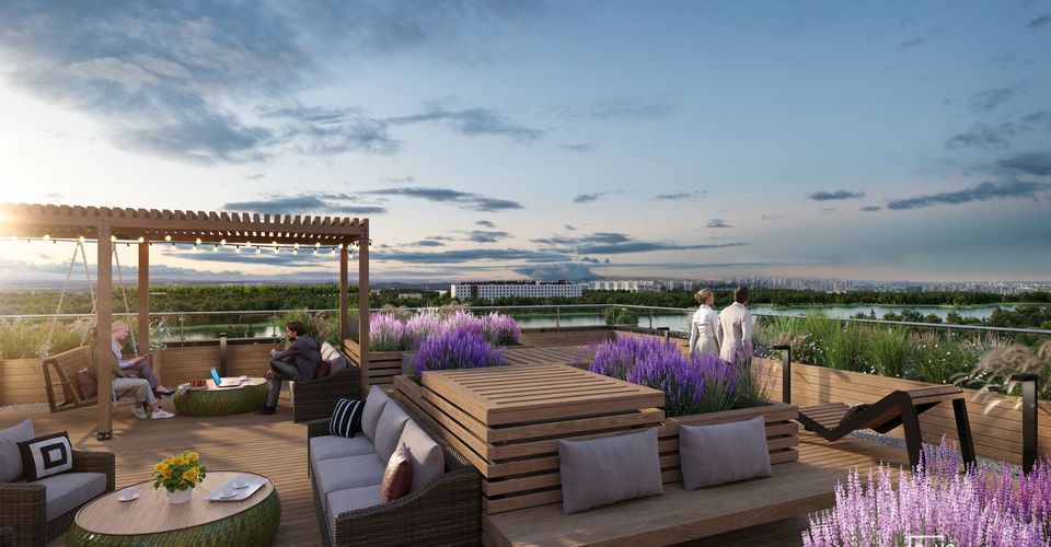 Вдоль 3-го корпуса со стороны двора будет благоустроен променад со скамьями для отдыха и велодорожка. А тех, кто обожает панорамные виды, ждут зоны отдыха на высоте девятого этажа, украшенные стильной террасной мебелью и цветочными композициями: здесь можно будет позаниматься йогой и сделать самые красивые фотографии.