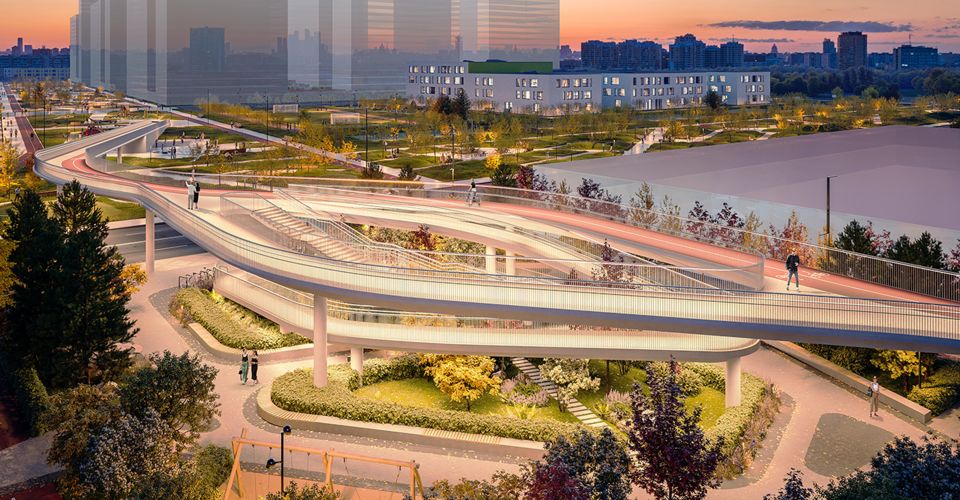 На мосту предусмотрено несколько лестниц с пандусами, так что попасть на него будет легко даже с коляской. Под мостом появится еще одна прогулочная зона — небольшой зеленый парк с местами для отдыха, где будет уютно и комфортно в любую погоду.