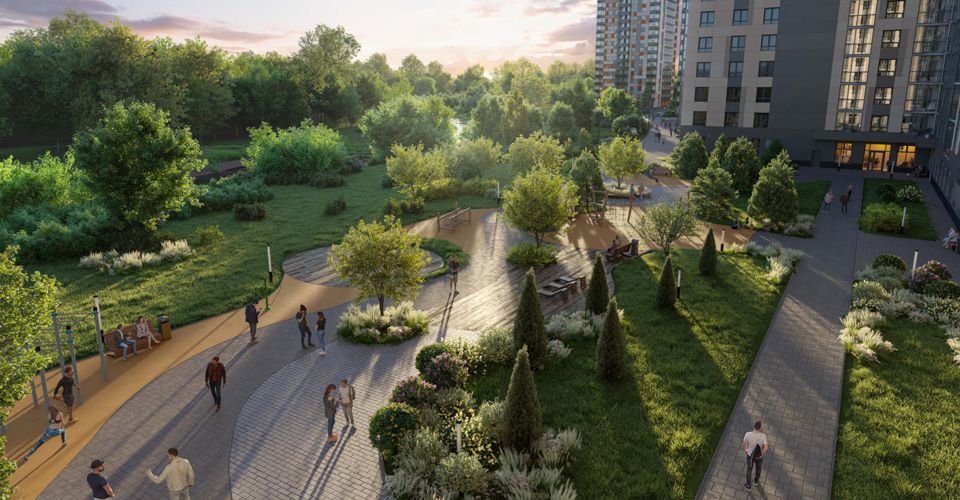 Пешеходные дорожки вдоль четырех жилых корпусов вымостят тротуарной плиткой. В конце променада обустроят зону отдыха со скамейками. Девелопер также установит детскую площадку с качелями и игровые комплексы из натуральных материалов. Кроме того, предусмотрено место для занятий воркаутом. Для обеих зон выбрано мягкое резиновое покрытие песочного цвета.