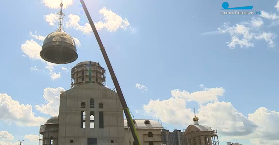 В храме великомученика Димитрия Солунского на Матисовом канале подняли центральный храмовый купол и крест.