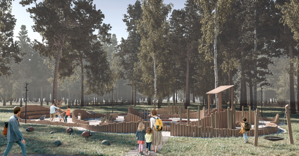 Концепцией предлагается разделить территорию на три основные функциональные зоны: пляжная, спортивная и прогулочная. В прогулочной части точечно образуются зоны притяжения, органично вписанными в лесную часть парка. Простые и лаконичные формы не доминируют и не отвлекают от природы. Будет реконструирована площадь с фонтаном, там появится входная группа в виде теневых навесов с качелями, а рядом появится удобная парковочная зона. На центральной поляне появится новая городская сцена.
