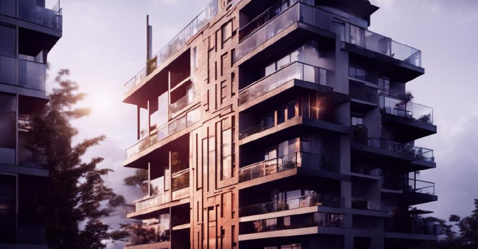 Дом переменной этажности имеет г-образную форму. Фасады здания облицованы пиленым кирпичом естественных природных оттенков. На внешней стороне стен предусмотрены корзины под кондиционеры. В каждой секции установлены лифты грузоподъемностью 630 и тысяча килограммов.