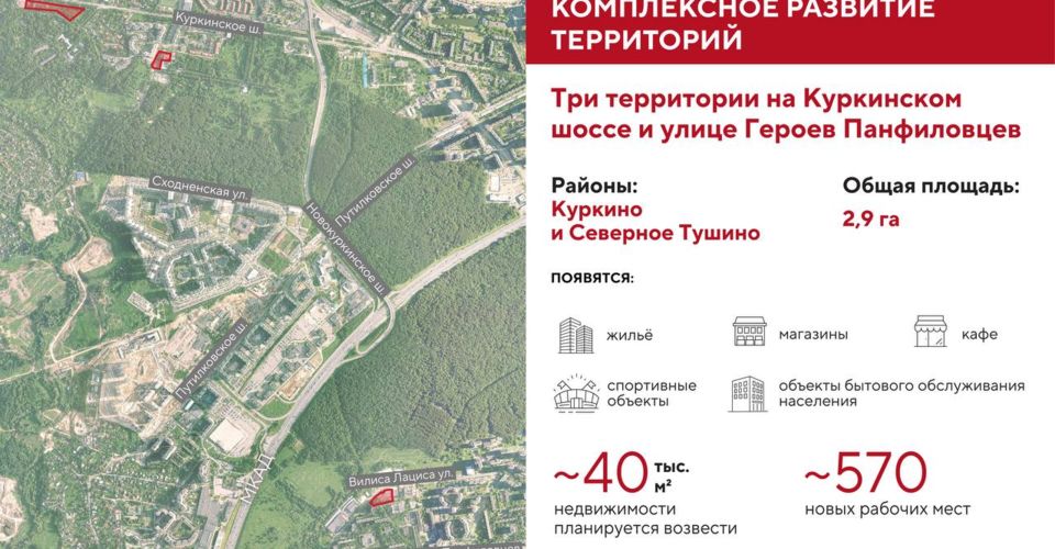 «Приняли решение о комплексном развитии трех территорий в районах Куркино и Северное Тушино. На месте устаревших построек на Куркинском шоссе и улице Героев Панфиловцев появится порядка 40 тысяч квадратных метров недвижимости: жилье и общественно-деловые объекты, в том числе спортивного и бытового назначения, магазины и кафе. Работу получат порядка 570 человек», — сообщил в своем телеграм-канале Сергей Собянин.