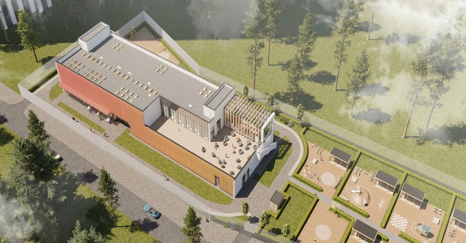 «С одной стороны двухэтажный детский сад украсят металлические ламели, окрашенные градиентом – в цвета от красного до желтого. Противоположный фасад выполнят в белом цвете и дополнят изображениями морских существ. С первого этажа на эксплуатируемую кровлю будет вести лестница», – сказал Сергей Кузнецов.