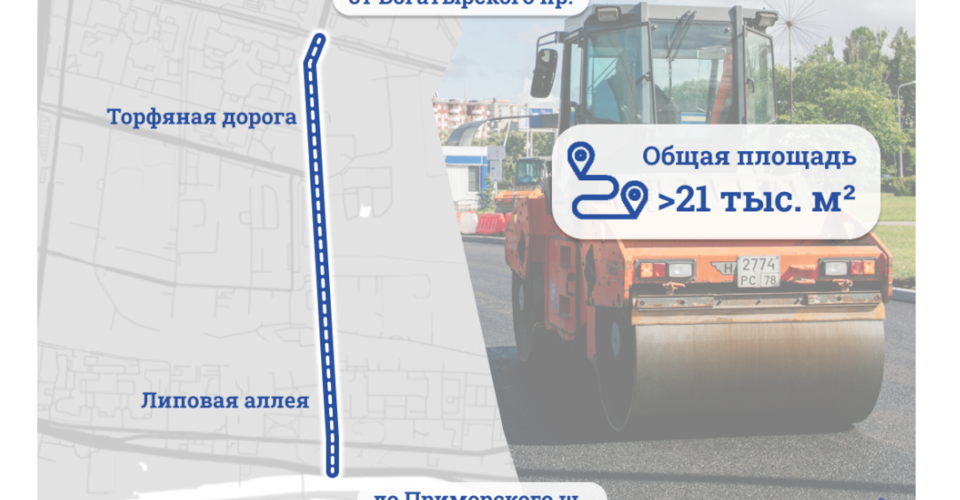 В связи с работами, с 27 мая по 30 июня 2025 года ограничивается движение транспорта по Липовой аллее от Приморского шоссе до железнодорожного переезда и по Торфяной дороге от железнодорожного переезда до Богатырского проспекта, включая перекрестки.