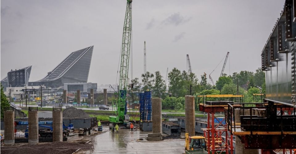 На строительной площадке будущей трассы М-32 продолжается возведение ключевого объекта – двухуровневой путепроводной транспортной развязки в районе «Лахта Центра».