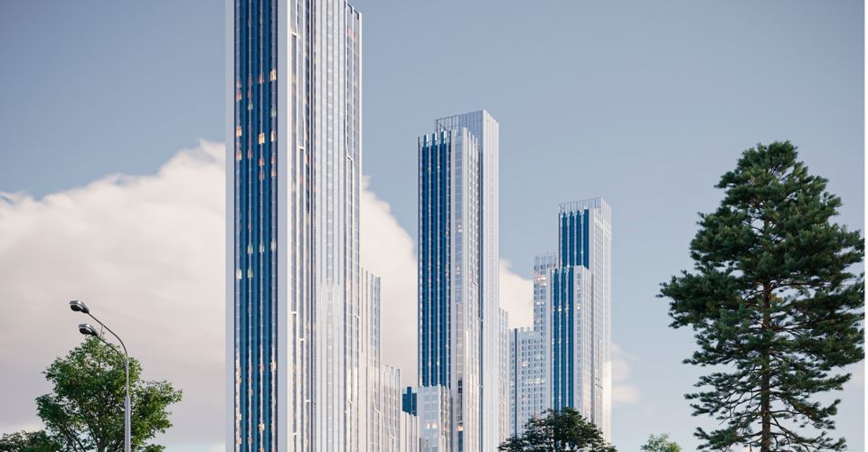 Дома получат сложную конфигурацию в виде подковы, внутри которой расположатся дворы. В секциях предусмотрено от двух до 58 этажей, их высотность каскадом будет снижаться в сторону парка. На перепадах кровли появятся террасы жилых квартир.