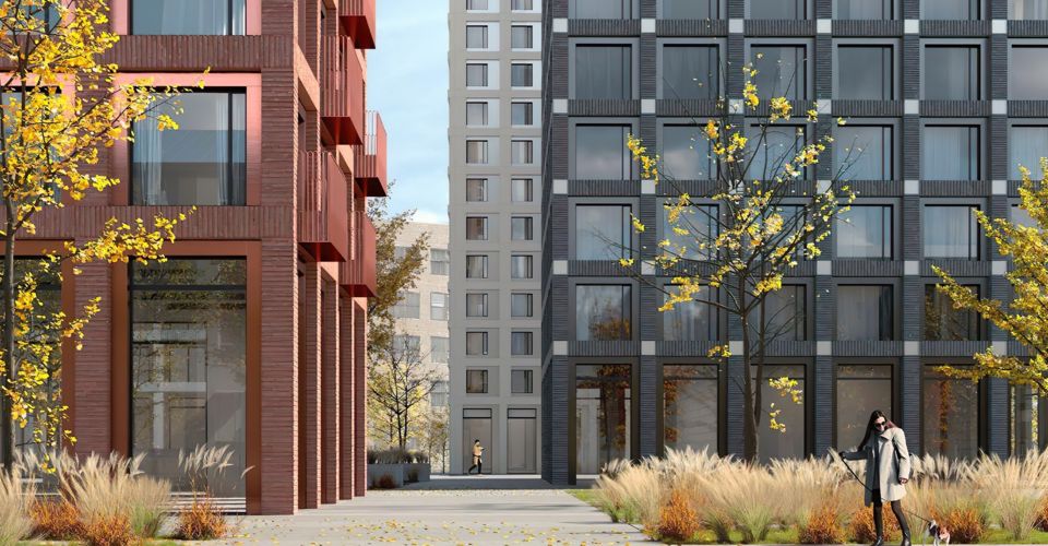 Фасады изготовлены из ригельной бетонной плитки, имитирующей клинкерный кирпич – отсылка к дореволюционному промышленному наследию места. Колористика корпусов проекта гармонично перекликается с цветами знаменитого Будёновского жилого массива.