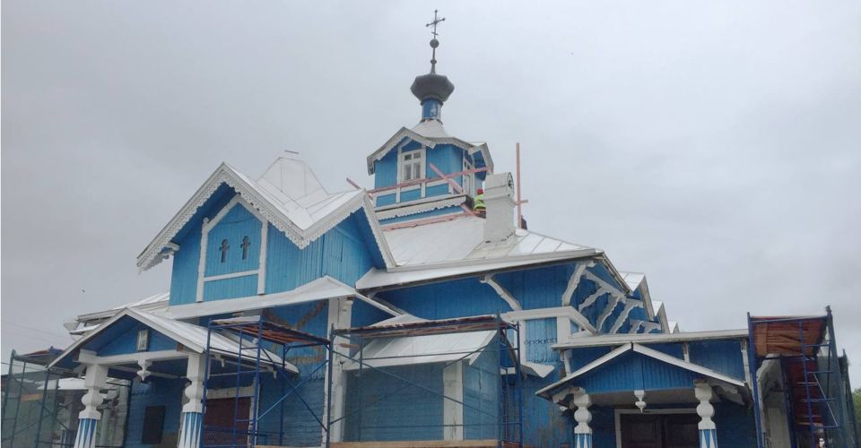 По согласованному КГИОП проекту реставрируется историческое убранство фасадов, в том числе элементы накладного декора в технике пропильной резьбы, а также крыльца и притвор.