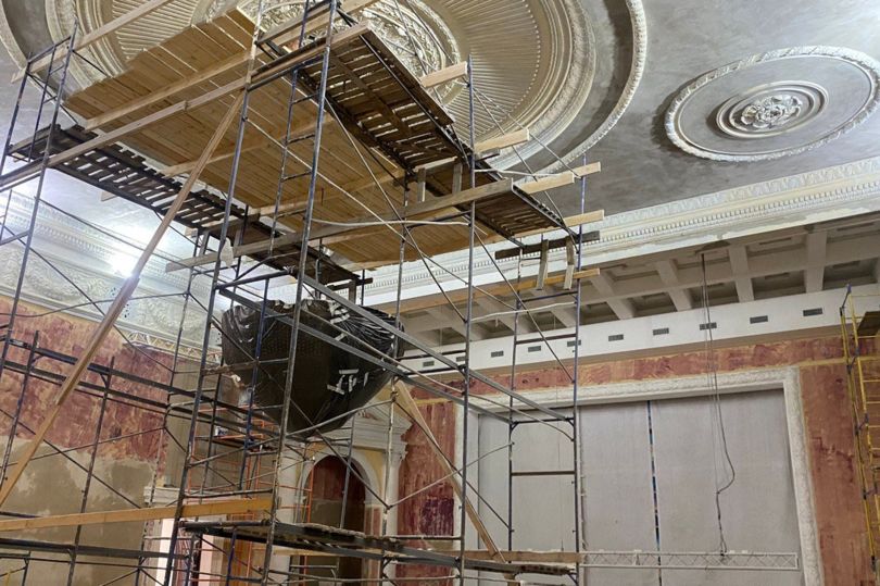 На сегодняшний день подрядчик расчистил лепнину, стены и потолок и начал малярно-штукатурные работы.