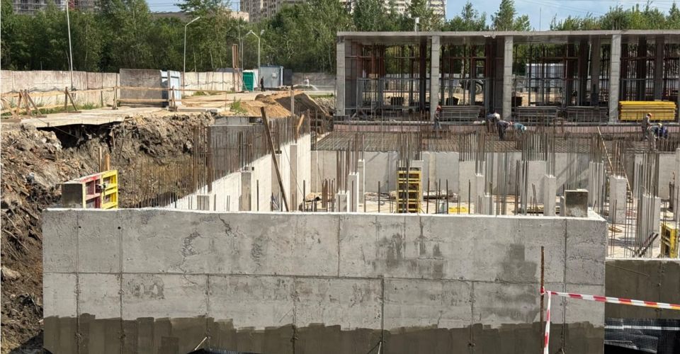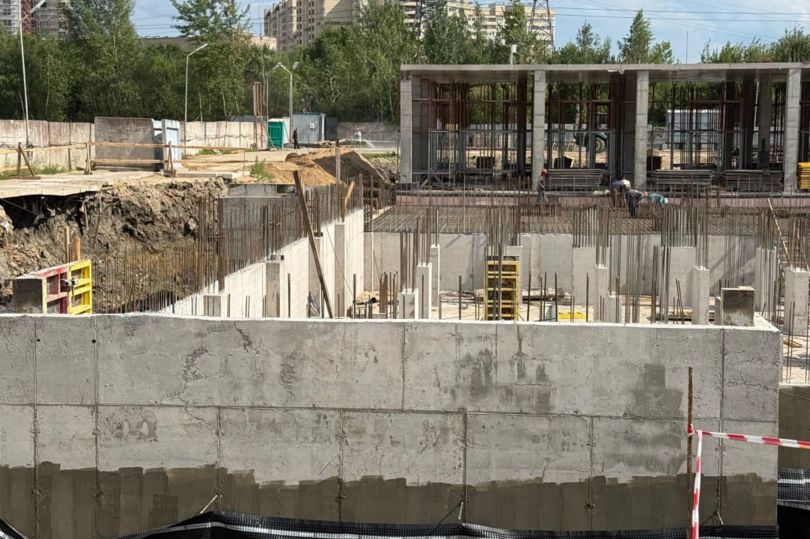 Завершены подготовительные работы и котлован, на 90% готовы фундаментные плиты, начался монтаж конструкций первого этажа.