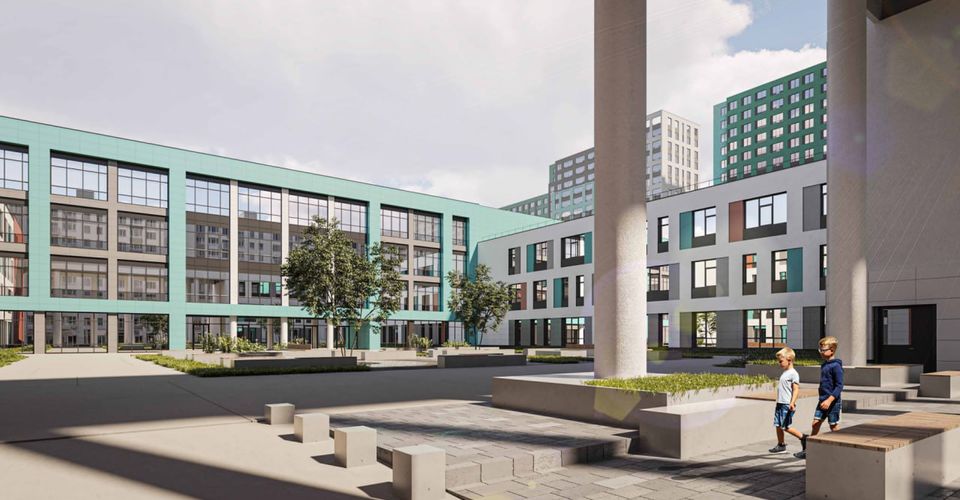Архитектурное решение подчёркивает открытость и современный характер района, в котором социальная инфраструктура развивается наравне с жилой застройкой.
