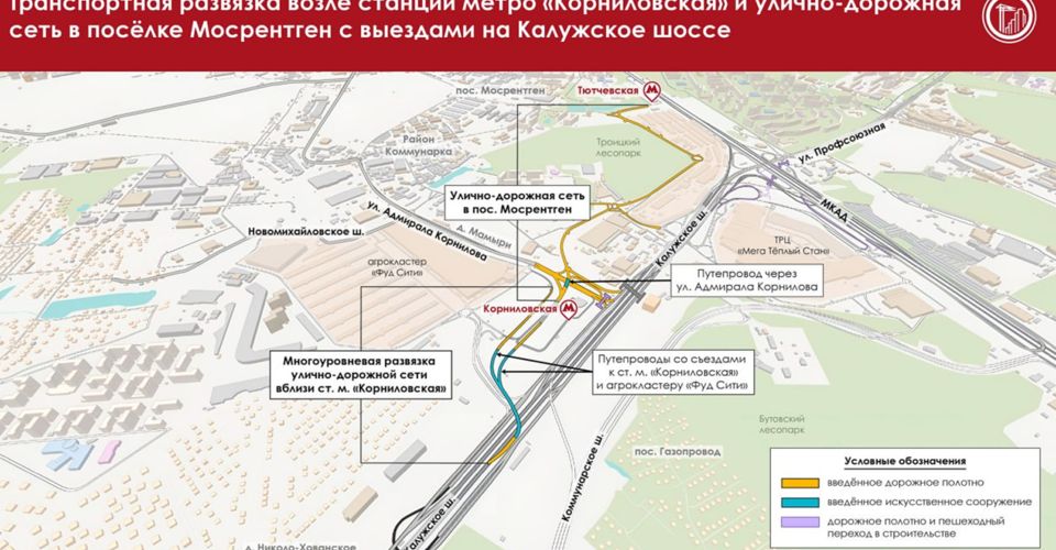 - два путепровода длиной 1,2 км со съездами с Калужского шоссе к станции метро «Корниловская» и к агрокластеру «ФУД СИТИ», с двумя полосами в одном направлении;