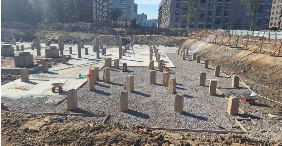 На Центральной улице строители заканчивают фундамент для нового поколения кудровчан. Следующий шаг — поднять стены четырёхэтажного здания.
