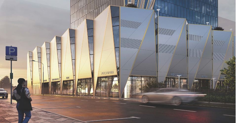 Бизнес-центр будет иметь футуристичный облик за счет использования стекла и алюминиевых кассет темно-серого и латунного цвета.