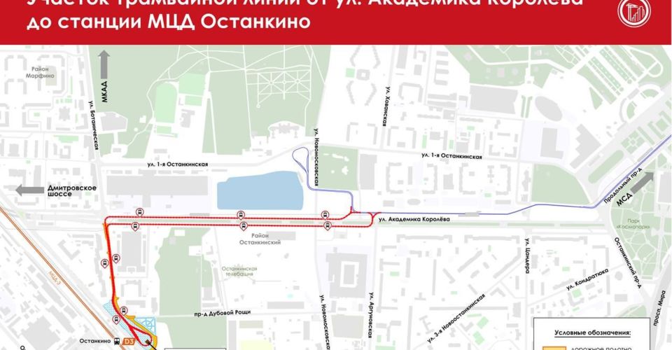 «Начались работы по проектированию участка продления трамвайной линии на ул. Академика Королёва до станции Останкино третьего Московского центрального диаметра. Она протянется на 1,6 км и пройдет мимо телецентра «Останкино» и вдоль ул. Дубовой Рощи с последующим выходом к станции третьего Московского центрального диаметра», – сказал Владимир Ефимов.