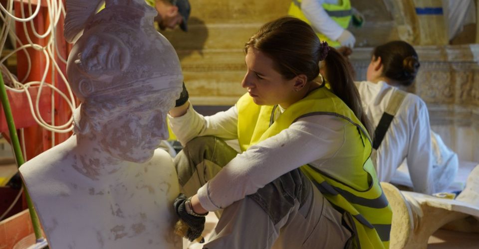 Также выполняется реставрация гипсовых бюстов героев античной мифологии, установленных на лепных консолях в арках стен, двух гипсовых скульптур «Римский воин» и «Греческий воин», лепного фриза с рельефами «Триумфальный въезд Александра Великого в Вавилон».