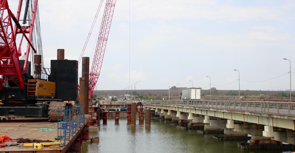 На данном участке уже сформирована строительная площадка, где активно идет возведение временного технологического моста. Это позволяет разместить строительную технику и проводить работы без ограничений движения по существующему искусственному сооружению. Также у берегов реки Миус начато формирование фундамента опор для строительства двух новых полос моста.