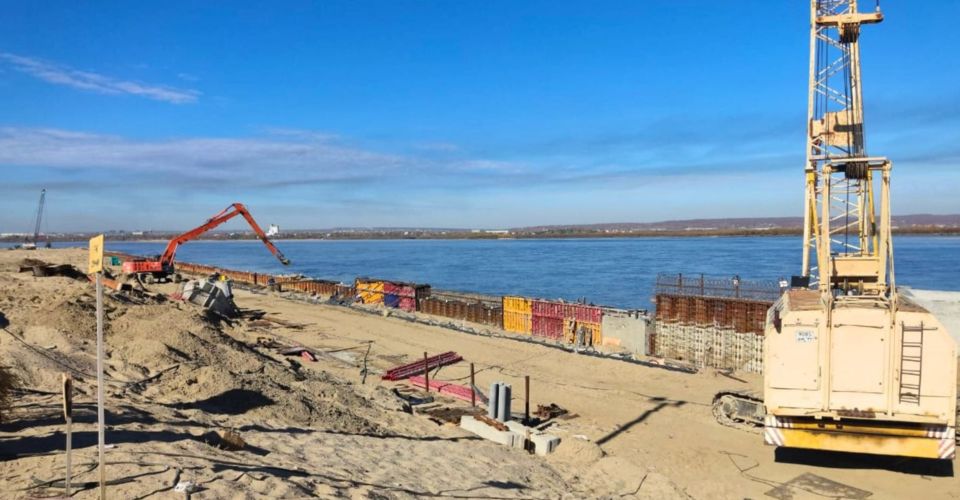 На данном этапе работы ведутся на береговой линии, это самый сложный участок, который уже несколько раз оказывался под водой из-за подъема Зеи. То есть работать на этом участке можно не в любое время, а только когда позволяет река.
