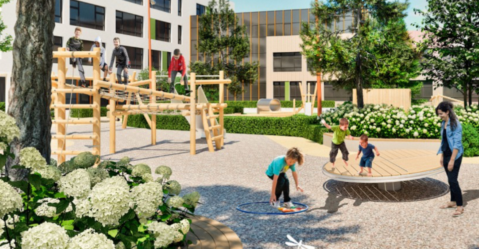 В школьном дворе построят стадион с футбольным полем, трибунами и беговой дорожкой, площадки для подвижных игр детей разных возрастов.