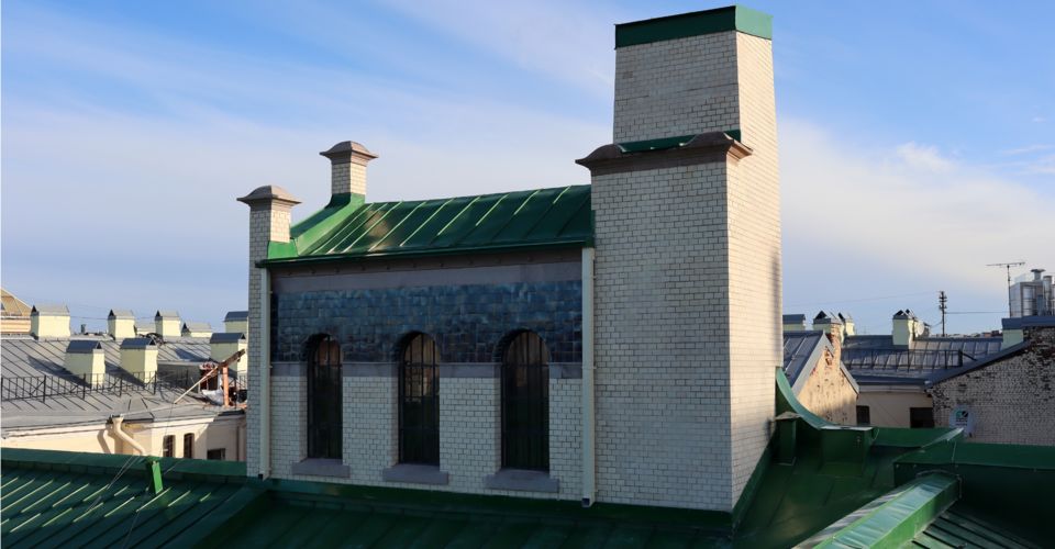 Отреставрированы гранитные элементы котельной, металлические окна, венчающий карниз со свесом и водосточными трубами, фриз из майоликовой плитки и стены из «кабанчика».