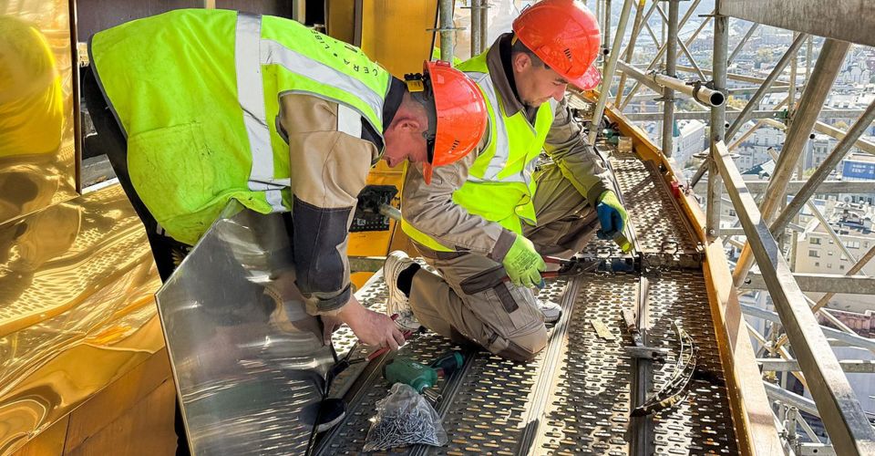 Под каждым снятым фрагментом приводят в порядок металлическую обрешетку купола и делают гидроизоляцию, новые листы устанавливают особым замковым способом, обеспечивающим полную герметичность. Общий вес покрытия составит около 15 тонн.