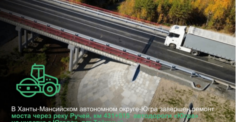 В Советском районе завершили работы по приведению в нормативное состояние двух мостов через Ручьи на километрах 430-м и 431-м автомобильной дороги «Югра», на участке г.Югорск – пгт.Таёжный. Работы завершены по новому национальному проекту «Инфраструктура для жизни». Протяженность ремонтируемого участка на 430-м км составила 181 метр, а на 431-м км составила 150 метров.