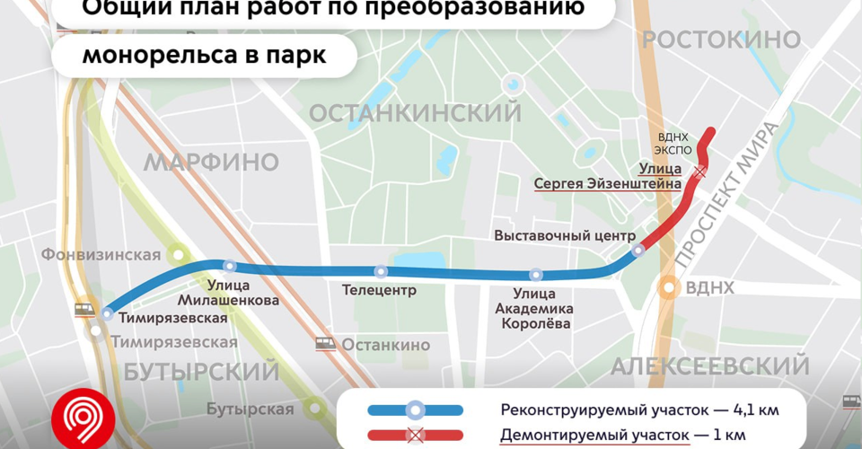 Это будет первый в России круглогодичный прогулочный парк на высоте 6 метров. Территория свяжет пять районов — Останкинский, Алексеевский, Тимирязевский, Марфино и Бутырский, где проживают больше 300 тысяч человек.