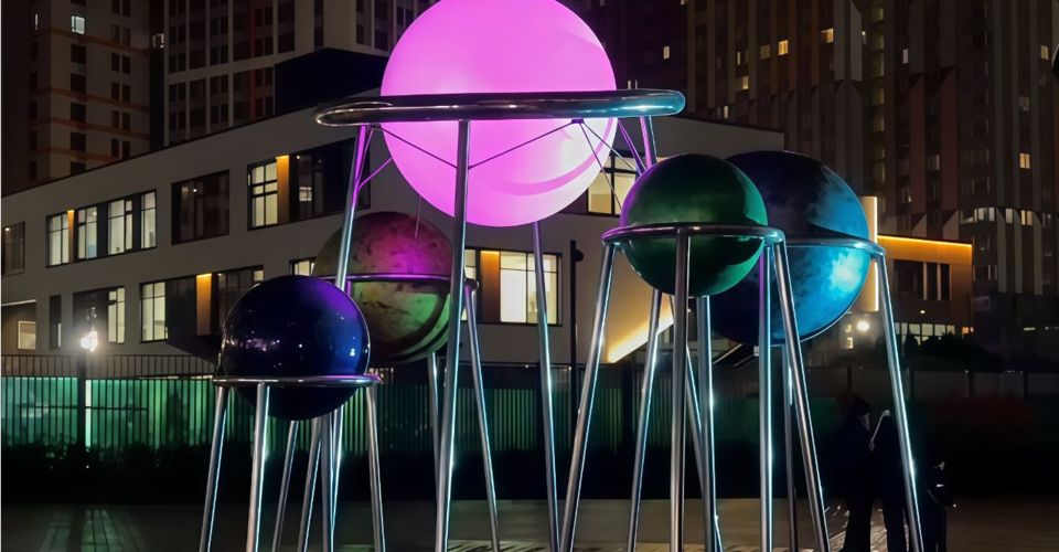 «Живая» инсталляция называется «Парад планет», однако искать в ней астрономическую точность или привязку к конкретным небесным телам нашей Солнечной системы не стоит. Композиция отсылает к бесконечному разнообразию Вселенной, которая объединяет огромный звездно-планетный архипелаг в единую плоскость – точно так же, как новый дом объединяет на своей территории жителей, таких разных по своим характерам и интересам.