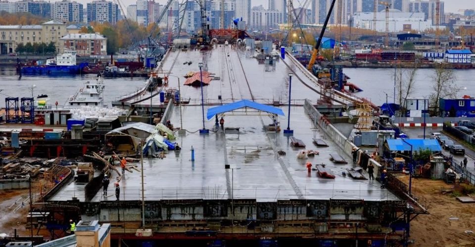 Губернатор сообщил, что сейчас идёт подготовка к важному этапу – установке разводного пролёта, состоящего из двух «крыльев» весом 400 тонн каждое. Они уже собраны на стапеле на левом берегу Невы, готова вся необходимая техника. На опорах смонтированы гидроцилиндры – их изготовил Обуховский завод.