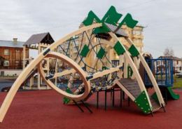 Рядом установили большой игровой комплекс "Бизон", тоже от "Авен". Семиметровая конструкция укомплектована двумя скатными горками, необычными сетками для лазания и мини-скалодромом. "Замковый" стиль поддержан декором в виде деревянных флагов.