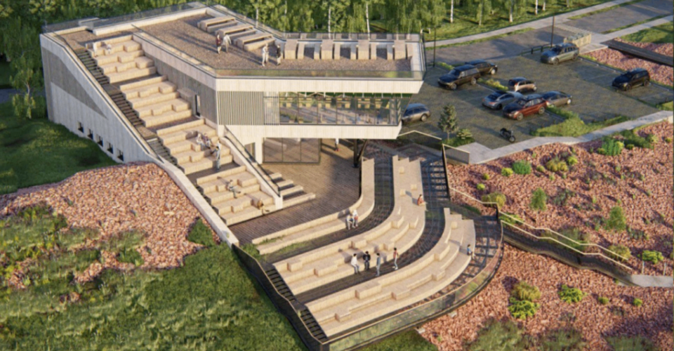 Среди живописной окружающей среды будет возведен двухэтажный туристический центр. Со стороны здание будет напоминать космический корабль, парящий в воздухе. На первом этаже будет предусмотрена входная группа с ресепшеном, сувенирная лавка, уборные, гардеробная, а также кафе с барной зоной. На втором этаже будет дополнительный обеденный зал, откуда можно будет подняться на смотровую площадку.