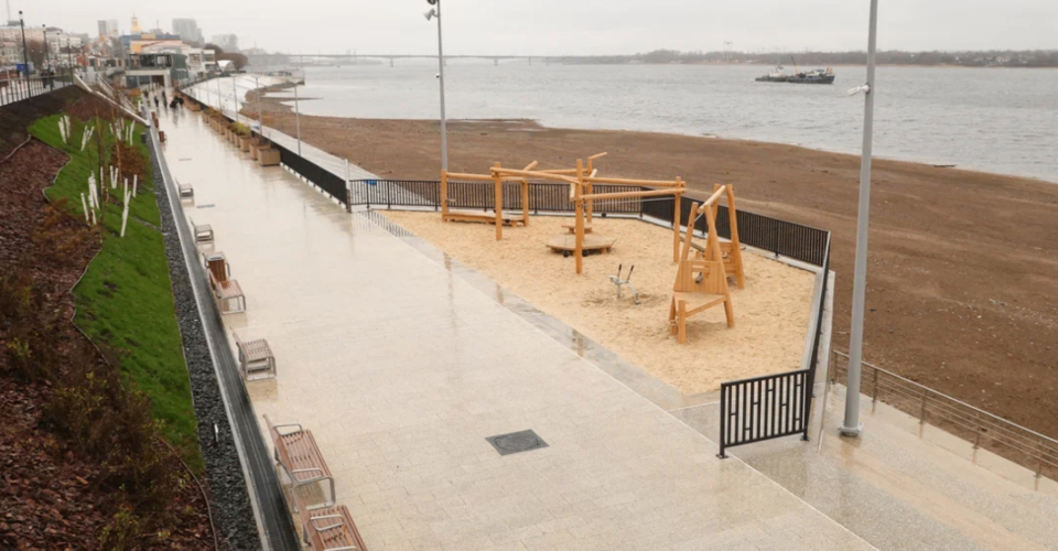 Благоустроена территория протяженностью 1,5 километра: центральным элементом стал широкий шестиметровый променад. Для велосипедистов сделана отдельная дорожка из красного бетона.