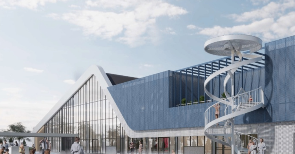 Будущее здание спроектировано в динамичной пластике и напоминает волну — такой образ выбран в связи с ключевой функцией комплекса. Внутри разместят большой бассейн для занятий водными видами спорта, а также трибуны для зрителей. Для семейного отдыха предусмотрены отдельные бассейны для взрослых и малышей с безопасным неглубоким дном.