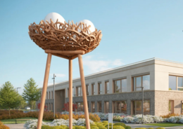Архитектурная концепция детского сада основана на образе «родительского гнезда» — тёплого и безопасного пространства, где ребёнок делает первые шаги в большой мир. Эта идея отражена в золотистых фасадах, ассоциирующихся с соломой и скорлупой, в решениях благоустройства и интерьеров.