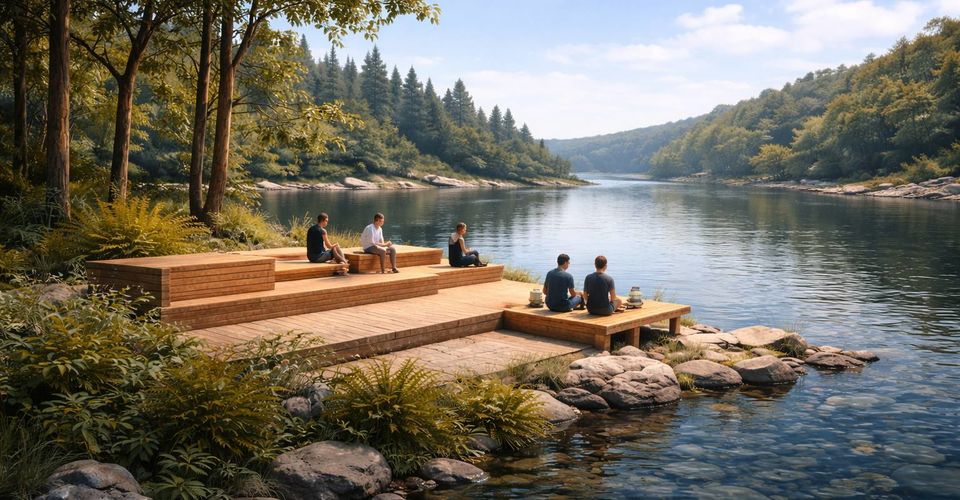 1. «Концепция ресипрокального павильона из дерева». Создайте структурно сложный и эстетичный объект с использованием взаимоподдерживающих деревянных конструкций. Павильон должен стать местом силы у воды, подчеркивающим гармонию с природой.