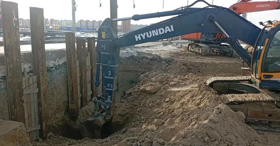 Продолжается строительство новой ливнёвки и на подходе к объекту со стороны Левобережья. Там уже сформирован ещё один котлован глубиной восемь метров под дождеприёмные и смотровые колодцы и трубопроводы.