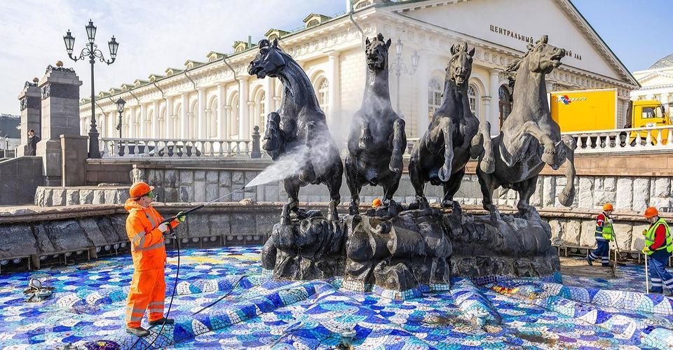 Специалисты тщательно промоют чаши, парапеты и наружные инженерные коммуникации. Особое внимание уделят скульптурам коней фонтана «Гейзер»: их декоративные детали очистят вручную мягкими кистями с применением специального средства, а затем промоют водой под давлением.