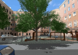 Сохранят дубы и клёны. Сделают живую изгородь для защиты от шума и загазованности, разобьют цветники, обновят газоны. Ключевой элемент — арт-объект «Лента»: конструкция на трёх уровнях с подвесом для качелей и скамьями для отдыха. Отремонтируют подпорную стенку и декоративное ограждение, заменят покрытие площадки на травмобезопасное полимерное.