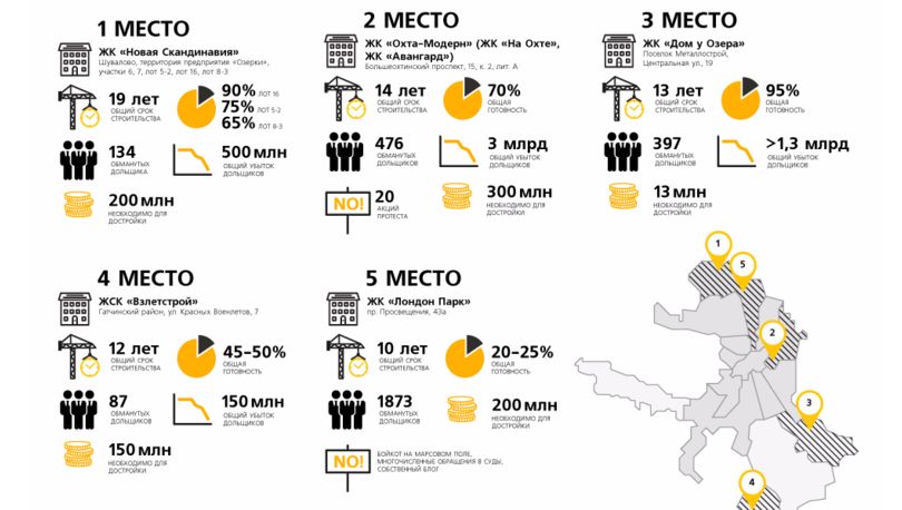 Они подготовили ТОП-5 долгостроев Петербурга. На первом месте ЖК «Новая Скандинавия», общий срок строительства которой составляет уже 19 лет. По информации «Фабрики новостей» готовность по разным лотам составляет там от 65 до 90%, а убытки дольщиков оцениваются в полмиллиарда рублей.
