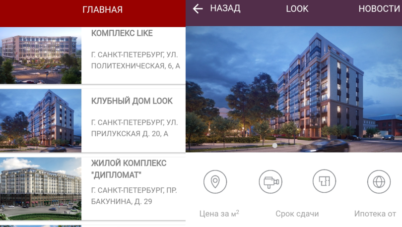 В мобильное приложение «ПСК» загружены описания и полная квартирография каждого строящегося объекта: клубного дома LOOK, ЖК бизнес-класса «Дипломат» и комплекса апартаментов LIKE. А также двух введённых в эксплуатацию жилых комплексов комфорт-класса: «Невский Эталон» и «Славянка 128».