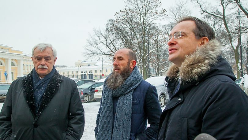 Губернатор Санкт-Петербурга Георгий Полтавченко и глава Министерства культуры РФ Владимир Мединский остались довольны отреставрированными фасадами Михайловского театра.